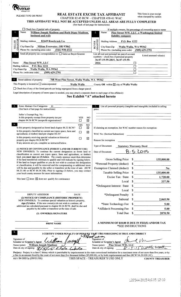 | 3 | 08/05/2015 | SWD | STATUTORY WARRANTY DEED | MADISON WILLIAM JOSEPH & RUTH DIANE | PINE STREET WW LLC | | 2-PARCELS | $135,000.00 | 128544 | 2015-06763 |