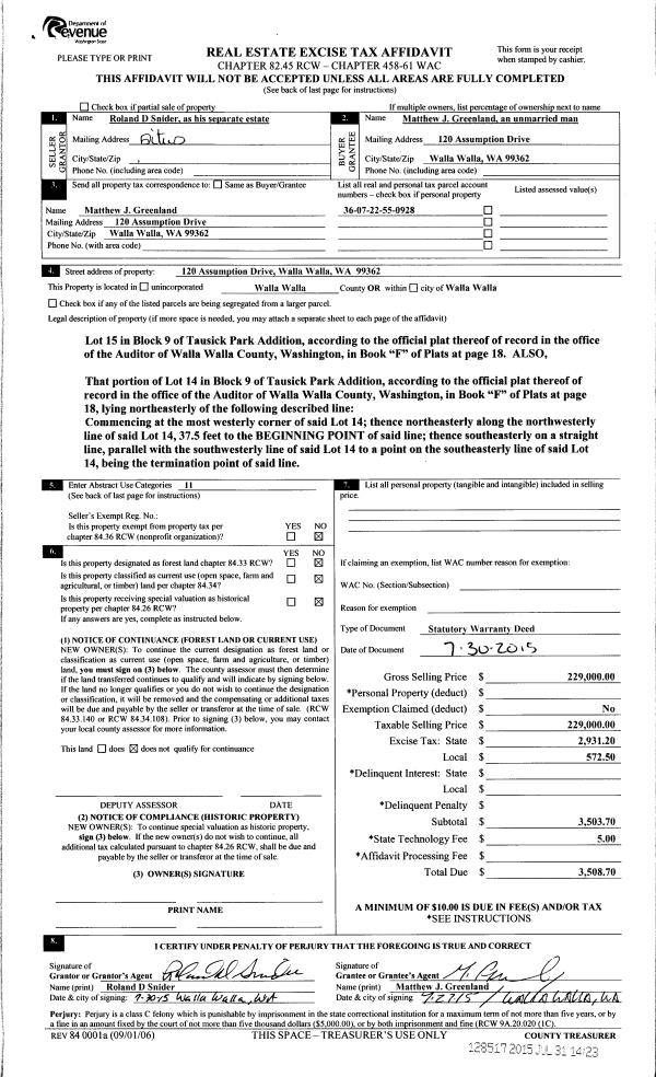 | 1 | 07/31/2015 | SWD | STATUTORY WARRANTY DEED | SNIDER ROLAND D & DARLENE | GREENLAND MATTHEW J | | | $229,000.00 | 128517 | 2015-06604 |