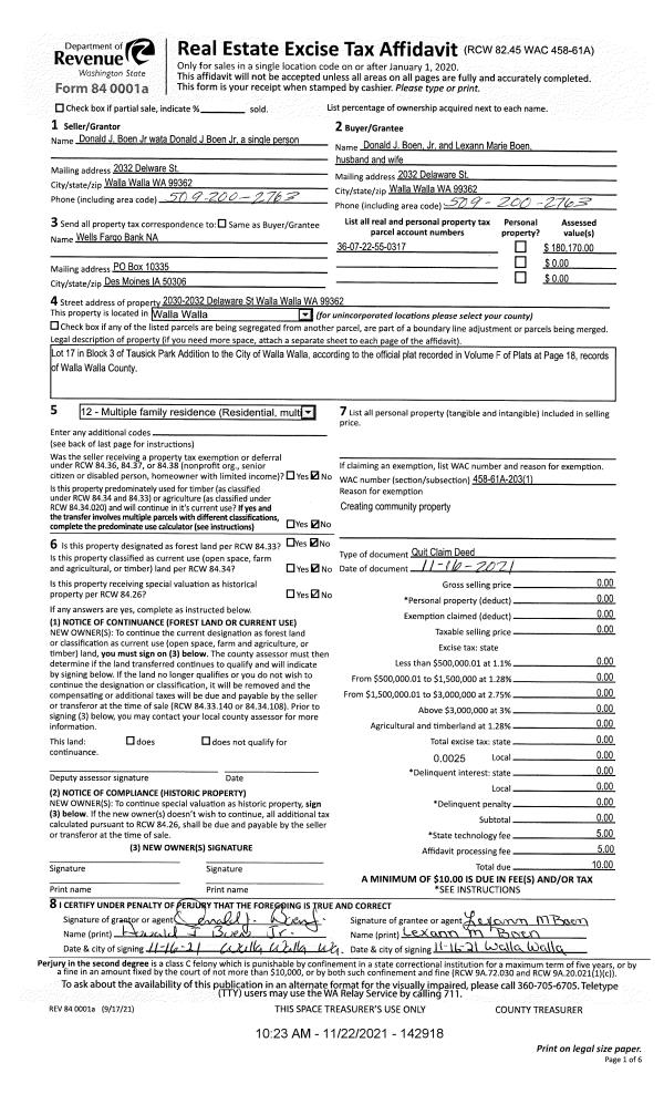 | 2 | 11/22/2021 | QCD | QUIT CLAIM DEED | BOEN DONALD J JR | BOEN DONALD J JR & LEXANN MARIE | | | $0.00 | 142918 | 2021-13820 |