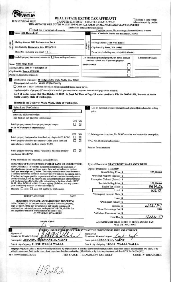 | 3 | 11/04/2010 | WARRANTY D | WARRANTY DEED | CRAIG, DONALD O & HELEN L ESTA | WOLFE, WADE H & ROSALEE K | | | $180,000.00 | 119283 | 2010-08966 |