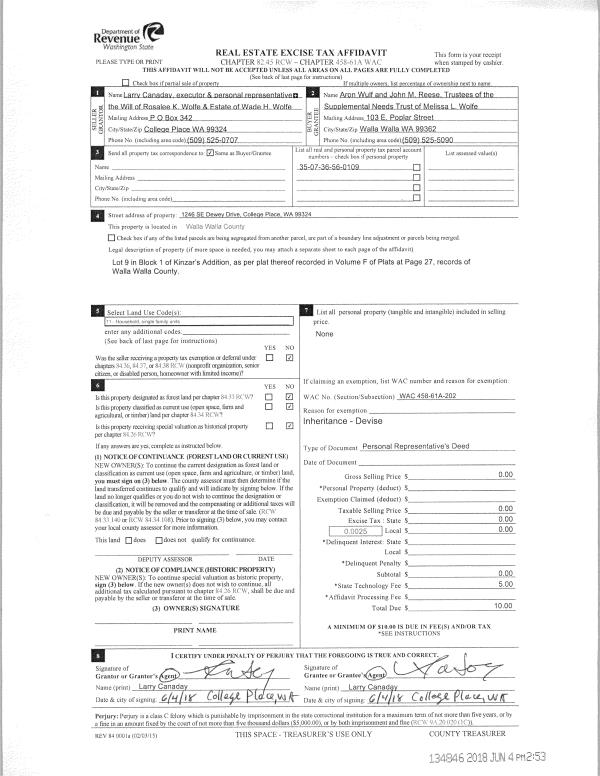 | 2 | 06/04/2018 | DPR | DEED OF PERSONAL REPRESENTATIVE | WOLFE WADE H & ROSALEE K ESTATE OF | WOLFE MELISSA L SUPPLEMENTAL NEEDS TRUST | | | $0.00 | 134846 | 2018-04451 |