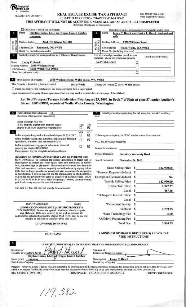 | 3 | 11/29/2010 | WARRANTY D | WARRANTY DEED | HAYDEN HOMES LLC | RUSCH, LEROY C & JESSICA L | | | $182,990.00 | 119382 | 2010-09786 |