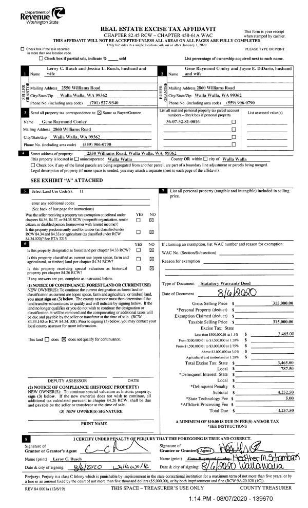 | 2 | 08/07/2020 | SWD | STATUTORY WARRANTY DEED | RUSCH LEROY C & JESSICA L | CONLEY GENE RAYMOND | | | $315,000.00 | 139670 | 2020-07758 |