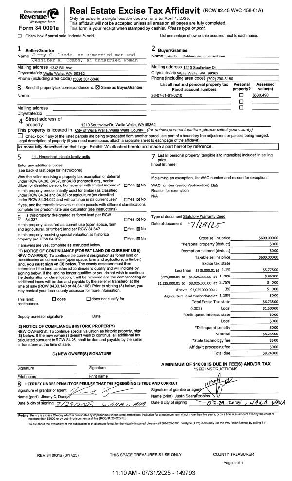| 1 | 07/29/2025 | SWD | STATUTORY WARRANTY DEED | DUEDE JIMMY C | ROBBINS JUSTIN S | | | $600,000.00 | 149793 | 2025-04467 |