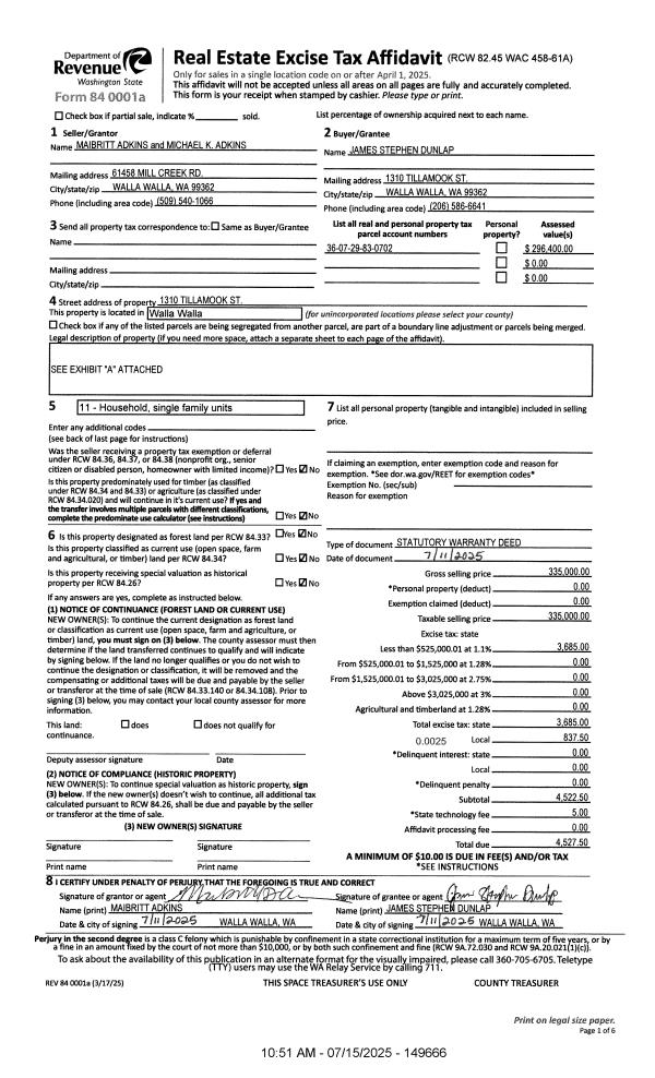 | 1 | 07/15/2025 | SWD | STATUTORY WARRANTY DEED | ADKINS MAIBRITT & MICHAEL K | DUNLAP JAMES STEPHEN | | | $335,000.00 | 149666 | 2025-04012 |