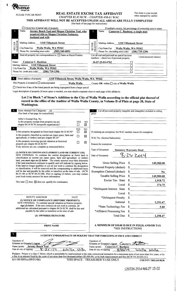 | 3 | 08/25/2014 | SWD | STATUTORY WARRANTY DEED | TEAL JEREMY BEACH | RUSHTON CAMERON C | | | $149,900.00 | 126536 | 2014-06284 |