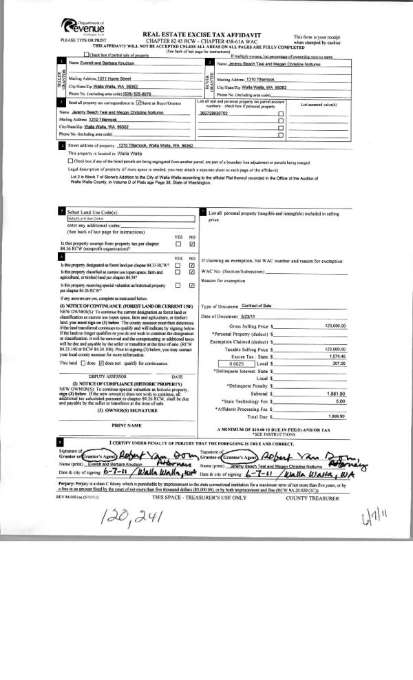 | 6 | 06/07/2011 | WARRANTY D | WARRANTY DEED | KNUDSON, EVERETT & BARBARA | TEAL, JEREMY BEACH | | | $123,000.00 | 120241 | 2011-04408 |