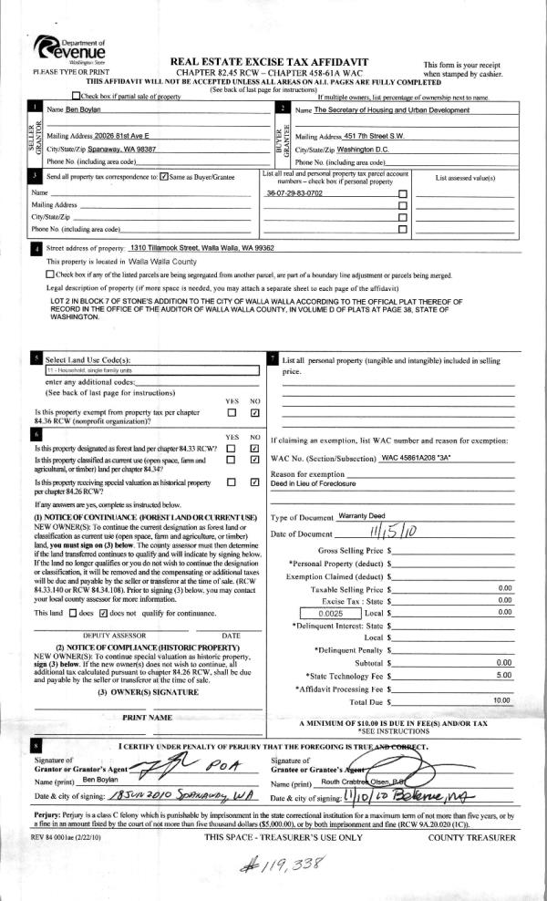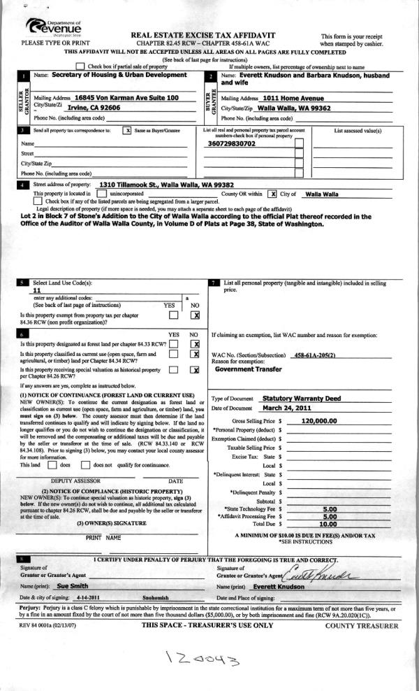 | 7 | 04/22/2011 | WARRANTY D | WARRANTY DEED | SECRETARY OF HOUSING & URBAN D | KNUDSON, EVERETT & BARBARA | | | $120,000.00 | 120043 | 2011-03302 |