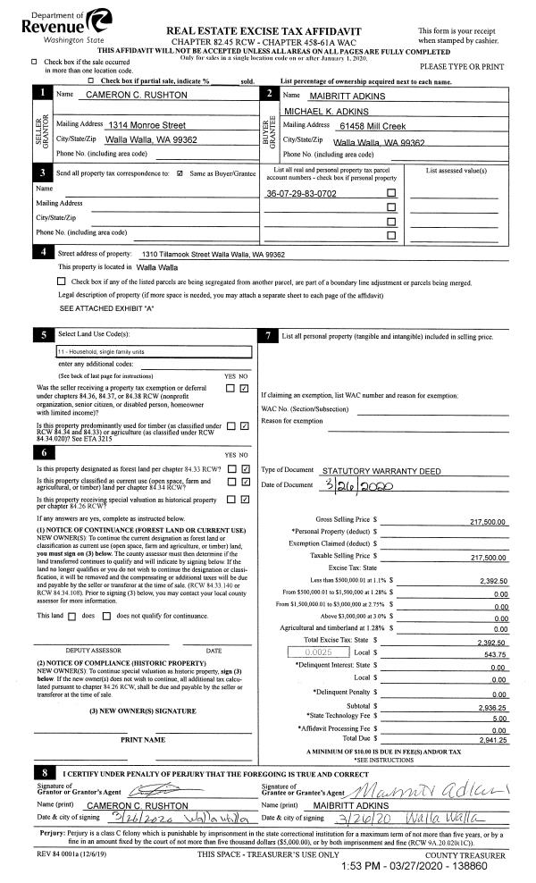 | 2 | 03/27/2020 | SWD | STATUTORY WARRANTY DEED | RUSHTON CAMERON C | ADKINS MAIBRITT & MICHAEL K | | | $217,500.00 | 138860 | 2020-02721 |