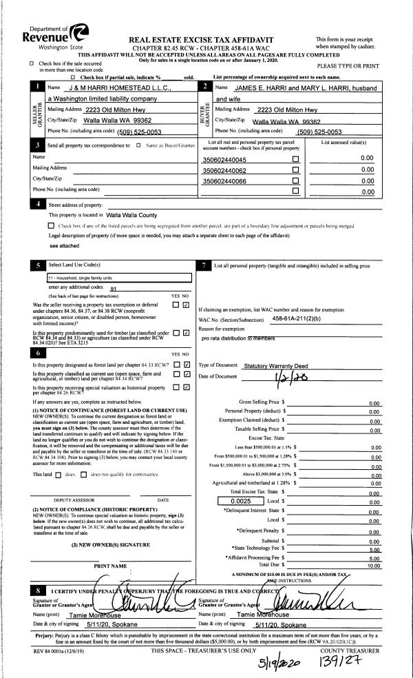 | 1 | 01/02/2020 | SWD | STATUTORY WARRANTY DEED | J & M HARRI HOMESTEAD LLC | HARRI JAMES E & MARY L | | | $0.00 | 139127 | 2020-04378 |