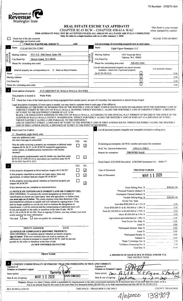 | 6 | 03/11/2020 | TRUSTEES D | TRUSTEE'S DEED | NEWMAN WILLIAM H & EUDEEN L | EIGHT FIGURE STRATEGIES LLC | | | $0.00 | 138909 | 2020-03082 |