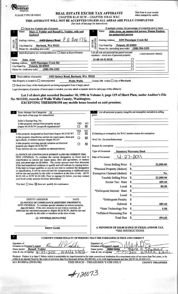 | 1 | 04/29/2011 | WARRANTY D | WARRANTY DEED | VEDDER, RUSSELL | ARNO, JOHN | | | $32,000.00 | 120073 | 2011-03458 |
