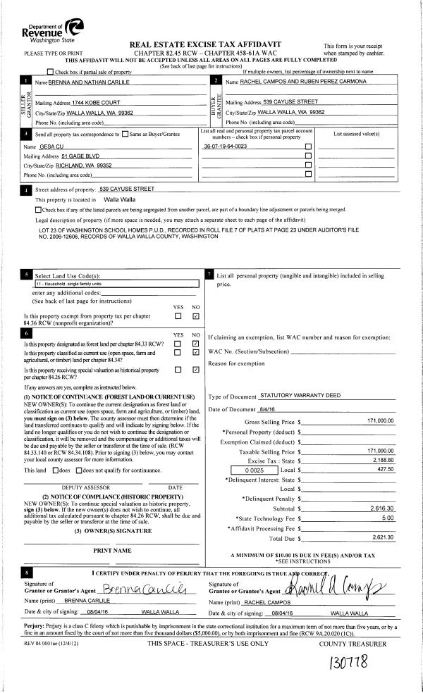 | 4 | 08/05/2016 | SWD | STATUTORY WARRANTY DEED | CARLILE NATHAN M & BRENNA L | CARMONA RUBEN PEREZ | | | $171,000.00 | 130778 | 2016-06207 |