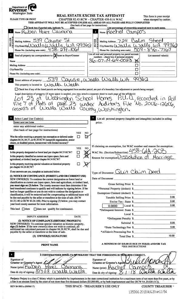 | 3 | 08/20/2018 | QCD | QUIT CLAIM DEED | CARMONA RUBEN PEREZ | CAMPOS RACHEL | | | $0.00 | 135366 | 2018-06811 |