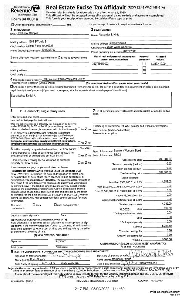 | 1 | 08/08/2022 | SWD | STATUTORY WARRANTY DEED | CAMPOS RACHEL | HINTZ ALEXANDER B | | | $399,000.00 | 144469 | 2022-06669 |