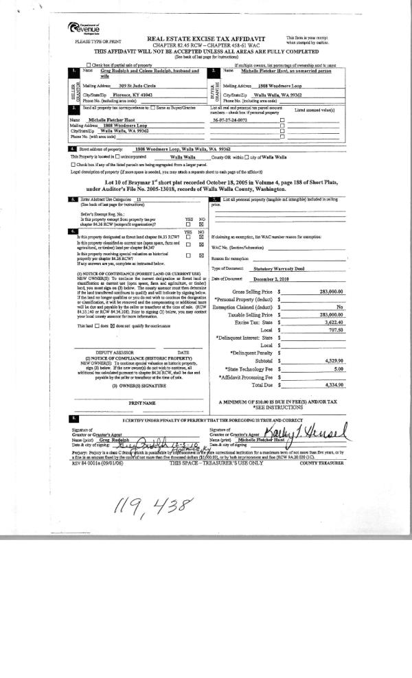 | 2 | 12/10/2010 | WARRANTY D | WARRANTY DEED | RUDOLPH, GREG & COLEEN | HUNT, MICHELLE FLETCHER | | | $283,000.00 | 119438 | 2010-10186 |