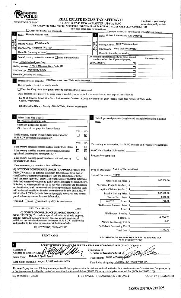 | 1 | 08/02/2017 | SWD | STATUTORY WARRANTY DEED | HUNT MICHELLE FLETCHER | HERRES ROBERT R & JULIA D | | | $307,500.00 | 132902 | 2017-05897 |