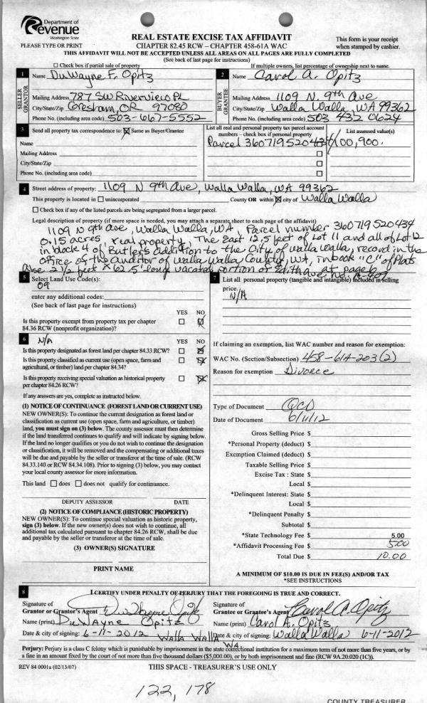 | 2 | 06/13/2012 | QCD | QUIT CLAIM DEED | OPITZ, DUWAYNE F | OPITZ, CAROL A | | | | 122178 | 2012-04890 |