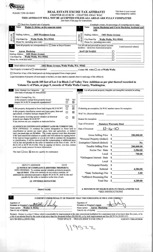 | 2 | 12/28/2010 | WARRANTY D | WARRANTY DEED | SIVLEY, WALTER S | HUCKSTEP, AARON & CARRIE | | | $280,000.00 | 119522 | 2010-10774 |