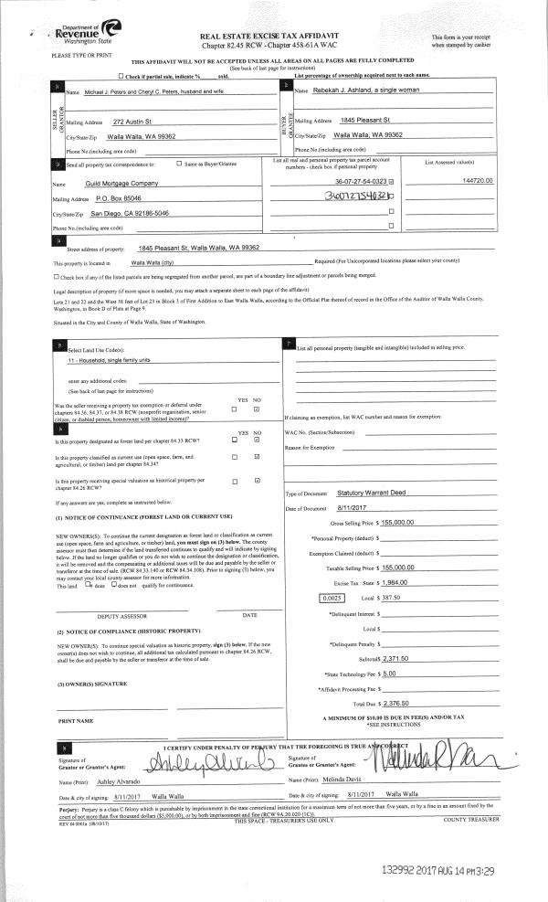 | 1 | 08/14/2017 | SWD | STATUTORY WARRANTY DEED | PETERS MICHAEL J & CHERYL C | ASHLAND REBEKAH J | | 2-PARCELS | $155,000.00 | 132992 | 2017-06218 |