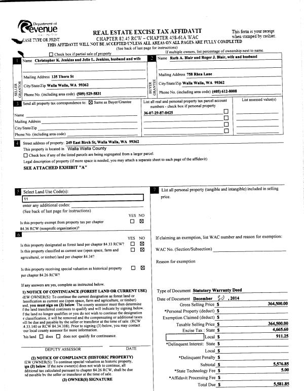 | 2 | 12/31/2014 | SWD | STATUTORY WARRANTY DEED | JENKINS CHRISTOPHER K & JOLIE L | BLAIR ROGER J & RUTH A | | | $364,500.00 | 127206 | 2014-09510 |