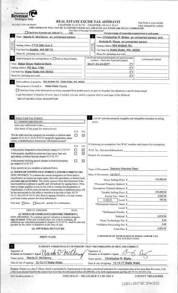 | 2 | 12/15/2017 | SWD | STATUTORY WARRANTY DEED | MC CLENNY MARDA D | BIGLEY CHRISTOPHER R | | | $315,000.00 | 133811 | 2017-10113 |