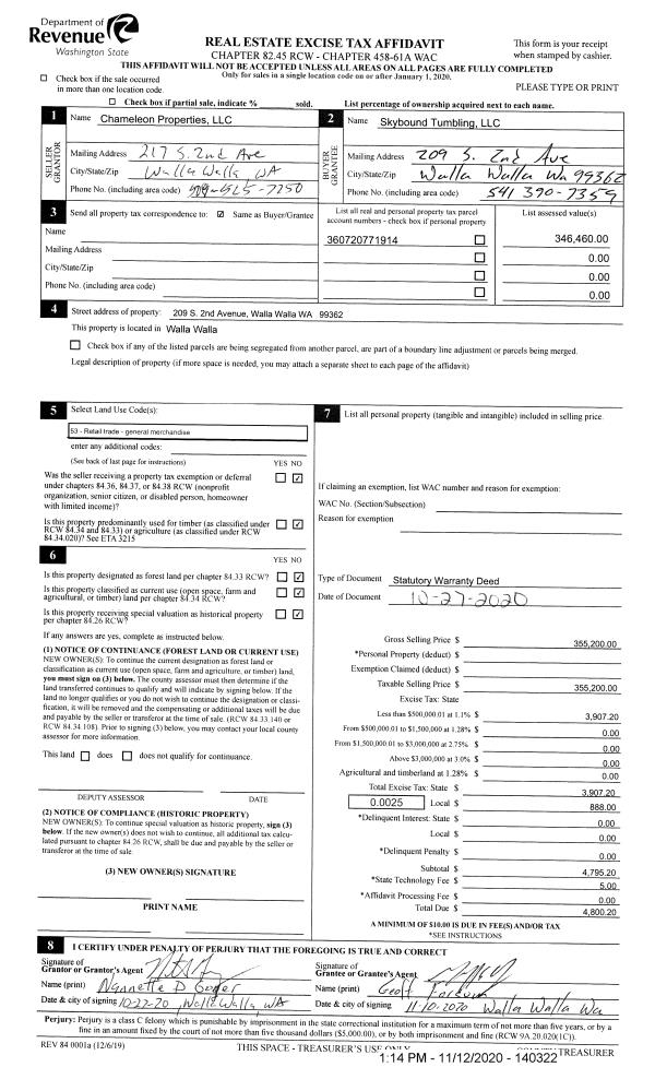 | 1 | 11/12/2020 | SWD | STATUTORY WARRANTY DEED | CHAMELEON PROPERTIES LLC | SKYBOUND TUMBLING LLC | | | $355,200.00 | 140322 | 2020-11917 |