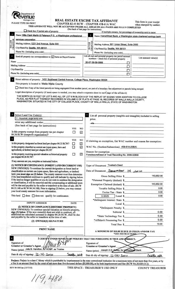 | 5 | 12/20/2010 | WARRANTY D | WARRANTY DEED | HILLIS CLARK MARTIN & PETERSON | HOMESTREET BANK | | | $143,652.00 | 119480 | 2010-10515 |