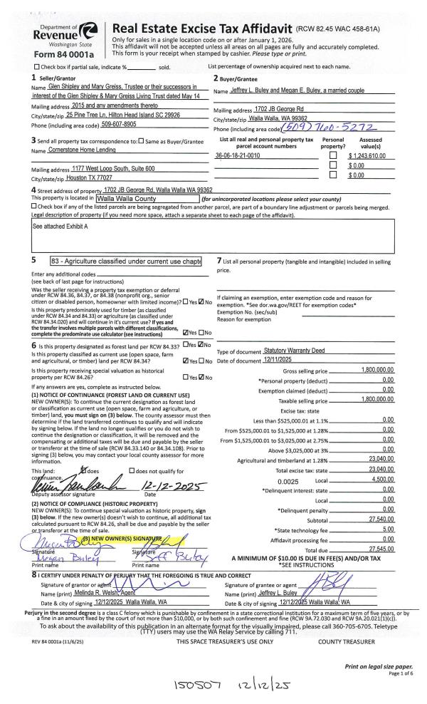 | 1 | 12/12/2025 | SWD | STATUTORY WARRANTY DEED | SHIPLEY GLEN & GREISS MARY LIVING TRUST | BULEY JEFFREY L & MEGAN E | | | $1,800,000.00 | 150507 | 2025-07640 |