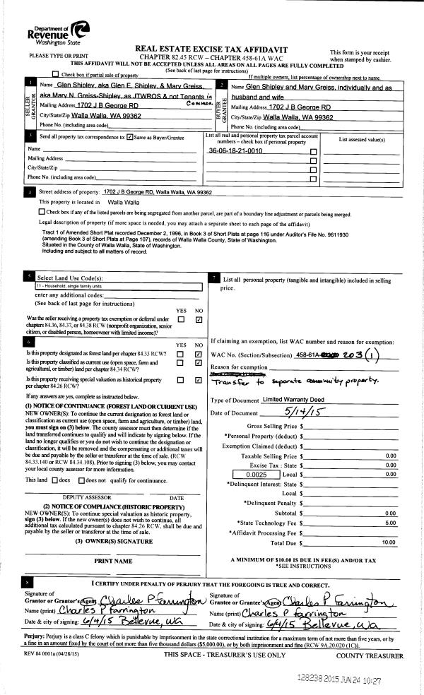 | 2 | 05/14/2015 | WARRANTY D | WARRANTY DEED | SHIPLEY GLEN | SHIPLEY GLEN & GREISS MARY LIVING TRUST | | | | 128239 | 2015-05311 |