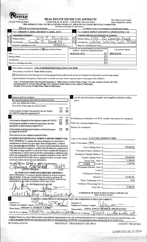 | 4 | 07/12/2013 | WARRANTY D | WARRANTY DEED | BASEL, GREGORY D & BECKY S | SHIPLEY, GLEN E | | | $875,000.00 | 124280 | 2013-07021 |