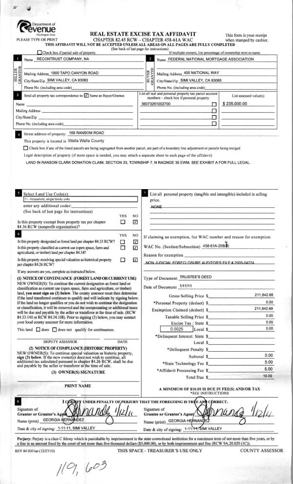 | 4 | 01/18/2011 | WARRANTY D | WARRANTY DEED | RECONTRUST COMPANY NA | FEDERAL NATIONAL MORTGAGE~ASSO | | | $211,842.00 | 119603 | 2011-00444 |