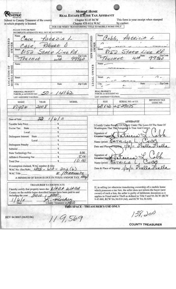 | Exterior Wall: | PLYWOOD | Heating/Cooling: | WARM & COOLED AIR | | Number of Bathrooms: | 2 | Number of Bedrooms: | 2 | | Plumbing: | 9 | Roof Covering: | COMP SHINGLE |