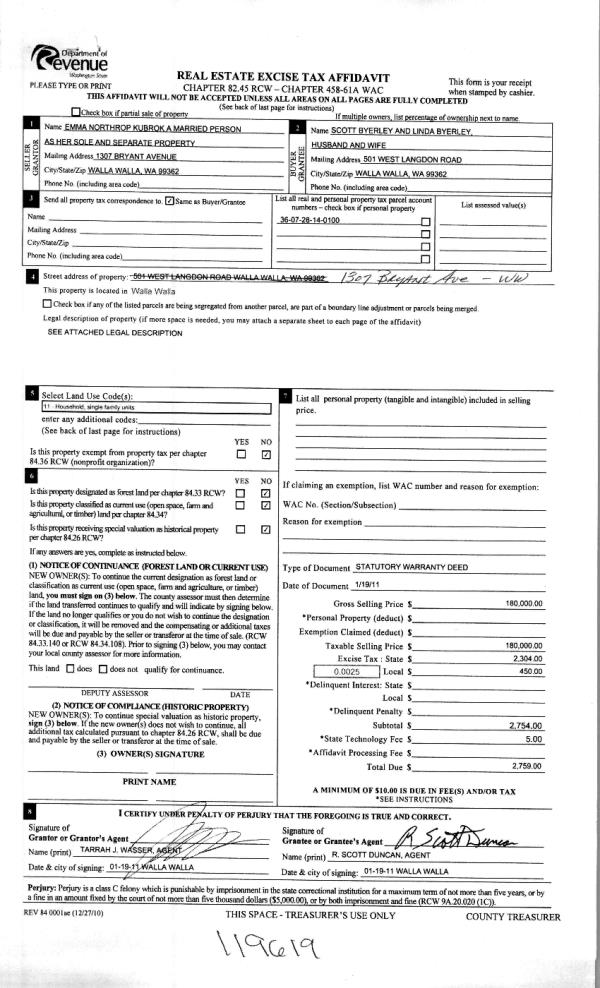 | 3 | 01/19/2011 | WARRANTY D | WARRANTY DEED | NORTHROP, EMMA | BYERLEY, SCOTT & LINDA | | | $180,000.00 | 119619 | 2011-00597 |