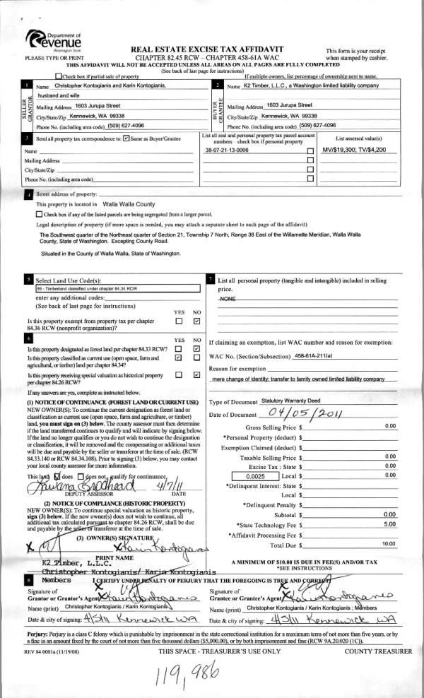 | 4 | 04/12/2011 | WARRANTY D | WARRANTY DEED | KONTOGIANIS, CHRISTOPHER & KAR | K2 TIMBER LLC | | | | 119986 | 2011-03023 |