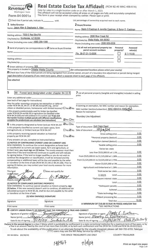 | 1 | 11/04/2024 | QCD | QUIT CLAIM DEED | ALLEN JASON | EASTMAN BYRON & MARY & | | | | 148467 | 2024-06416 |