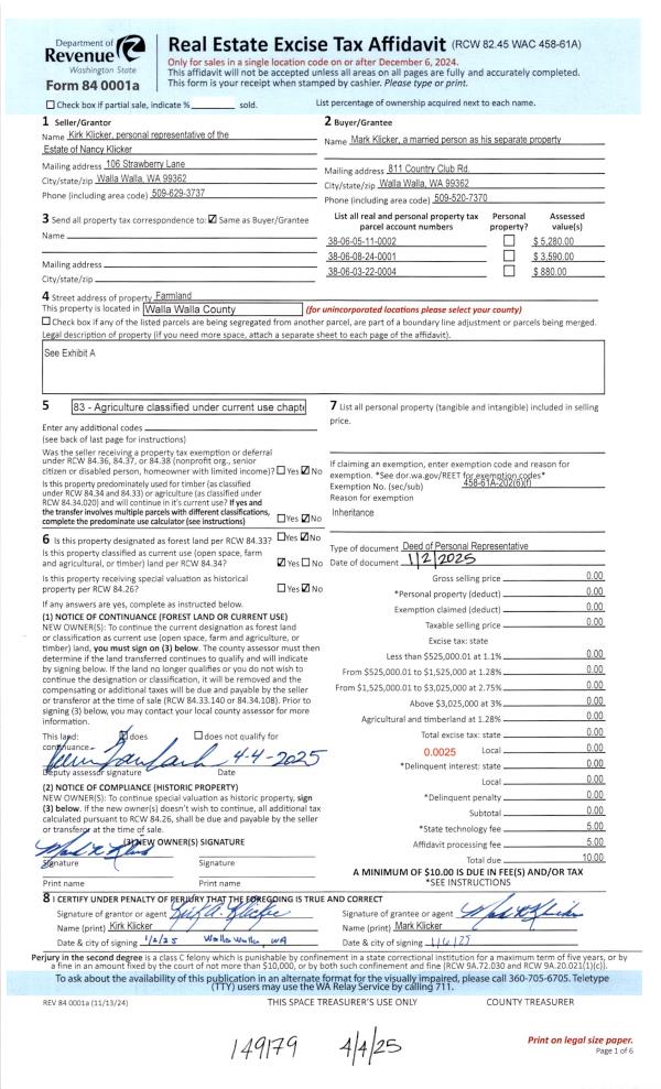 | 1 | 04/04/2025 | DPR | DEED OF PERSONAL REPRESENTATIVE | KLICKER NANCY L ESTATE OF | KLICKER MARK R & LISA O KLICKER | | | | 149179 | 2025-01789 |