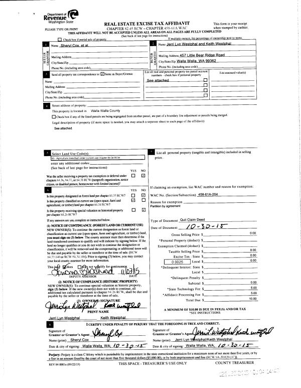 | 1 | 10/30/2015 | QCD | QUIT CLAIM DEED | COX SHERYL ET AL | WESTPHAL KEITH & JERRI LYN | 13 PARCELS | | | 129135 | 2015-09617 |