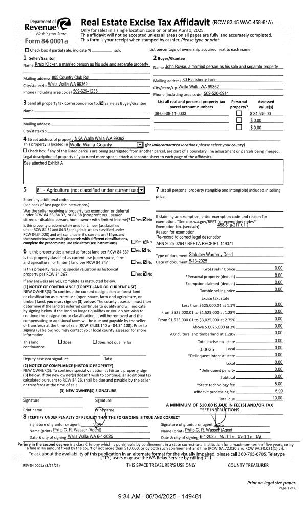 | 1 | 06/04/2025 | WARRANTY D | WARRANTY DEED | KLICKER KRAIG | ROYSE JOHN | | | | 149481 | 2025-03119 |