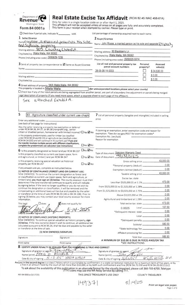 | 2 | 05/14/2025 | WARRANTY D | WARRANTY DEED | KLICKER KRAIG | ROYSE JOHN | | | $43,000.00 | 149371 | 2025-02647 |