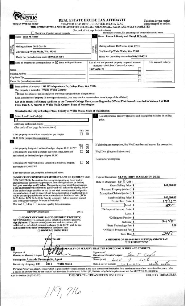 | 3 | 02/09/2011 | WARRANTY D | WARRANTY DEED | HUBER, JOHN M | DOWDY, ROSCOE L & CHERYL R | | | $140,000.00 | 119716 | 2011-01269 |