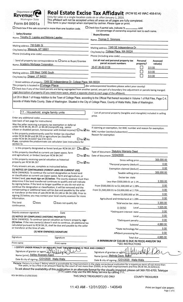 | 1 | 12/31/2020 | SWD | STATUTORY WARRANTY DEED | LAPSLEY TIMOTHY D & MELONIE | SIMMONS THOMAS D | | | $305,000.00 | 140649 | 2020-14020 |
