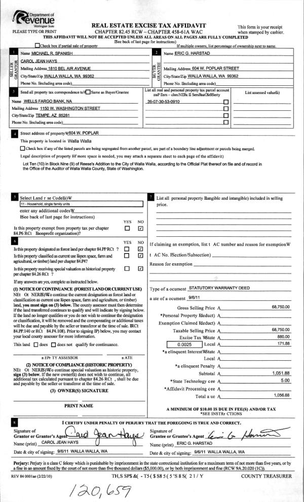 | 2 | 09/07/2011 | WARRANTY D | WARRANTY DEED | SPANISH, MICHAEL R | HARSTAD, ERIC G | | | $68,750.00 | 120659 | 2011-06981 |