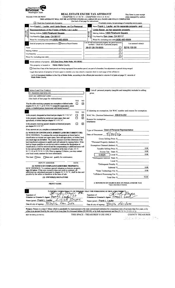 | 2 | 04/30/2016 | DPR | DEED OF PERSONAL REPRESENTATIVE | LAUFER BETTY L | LAUFER FRANK L | | | | 130214 | 2016-03610 |
