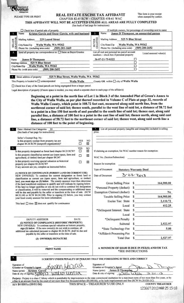 | 3 | 03/25/2013 | WARRANTY D | WARRANTY DEED | GARCIA, OSCAR & KRISTEN | THOMPSON, JAMES D | | | $164,900.00 | 123667 | 2013-02857 |