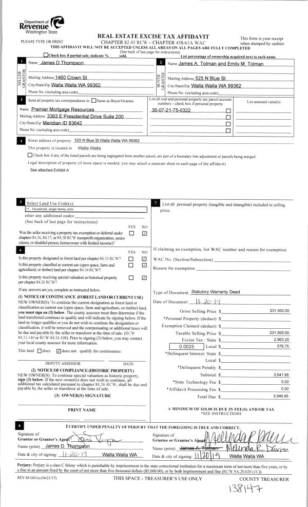 | 2 | 11/22/2019 | SWD | STATUTORY WARRANTY DEED | THOMPSON JAMES D | TOLMAN JAMES A & EMILY M | | | $231,500.00 | 138147 | 2019-09719 |