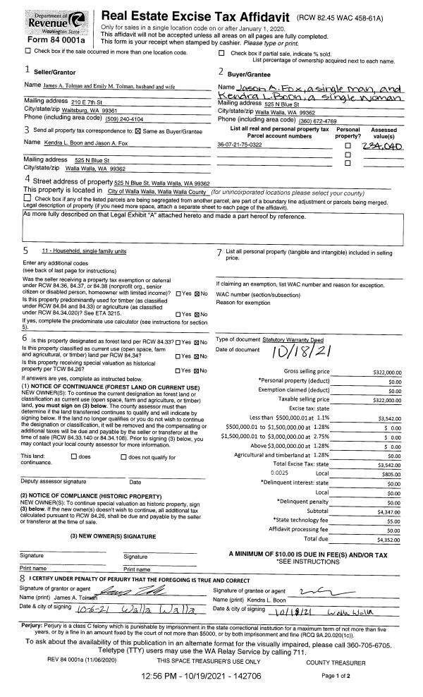 | 1 | 10/19/2021 | SWD | STATUTORY WARRANTY DEED | TOLMAN JAMES A & EMILY M | FOX JASON A | | | $322,000.00 | 142706 | 2021-12680 |