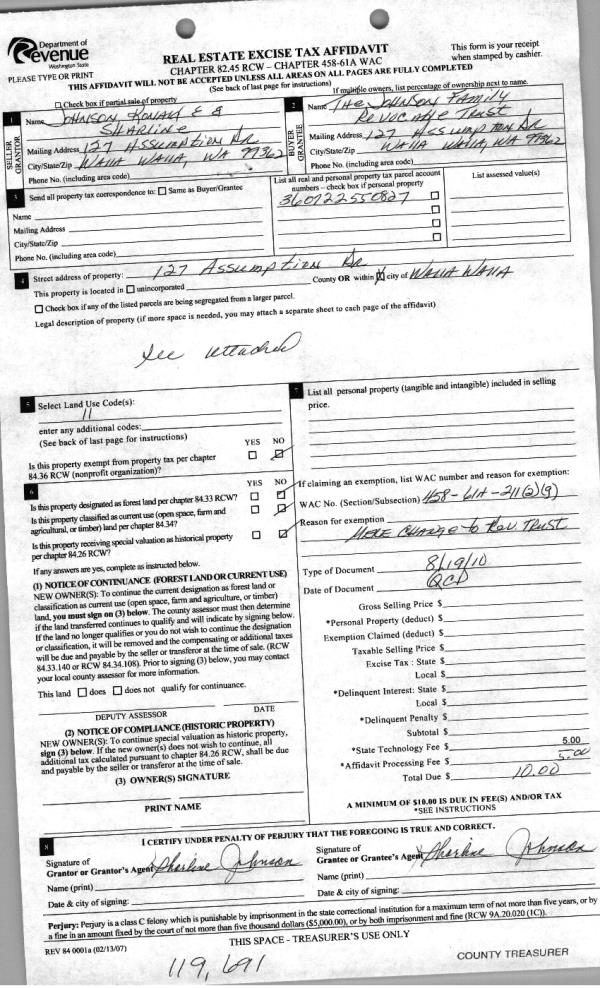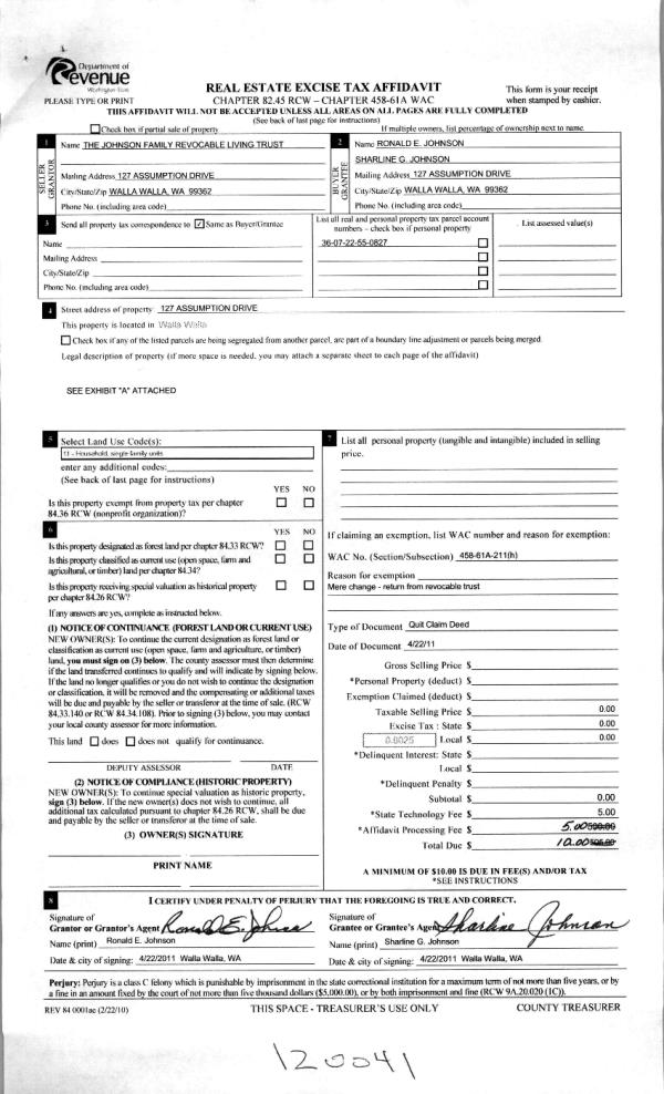 | 4 | 02/03/2011 | QCD | QUIT CLAIM DEED | JOHNSON, RONALD E & SHARLINE G | JOHNSON FAMILY REVOCABLE LVG T | | | | 119691 | 2011-01102 |