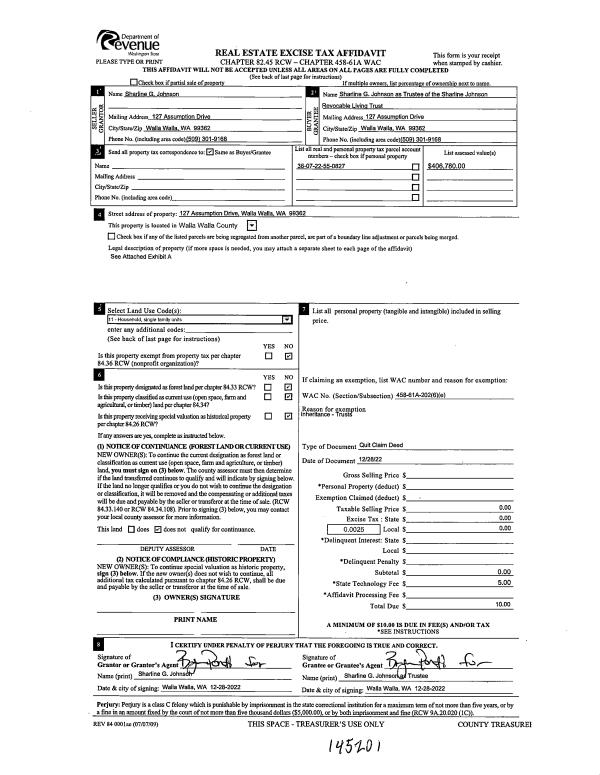 | 1 | 12/28/2022 | QCD | QUIT CLAIM DEED | JOHNSON SHARLINE G | SHARLINE JOHNSON REVOCABLE LIVING TRUST | | | $0.00 | 145201 | 2022-09957 |