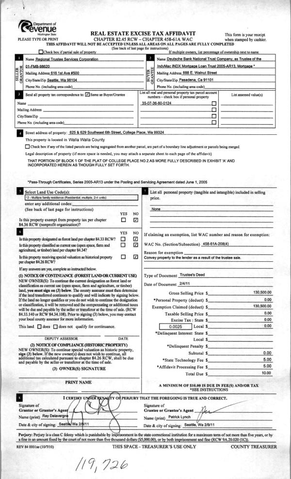 | 4 | 02/11/2011 | WARRANTY D | WARRANTY DEED | REGIONAL TRUSTEE SERVICES CORP | DEUTSCHE BANK NATIONAL TRUST C | | | $130,500.00 | 119726 | 2011-01369 |